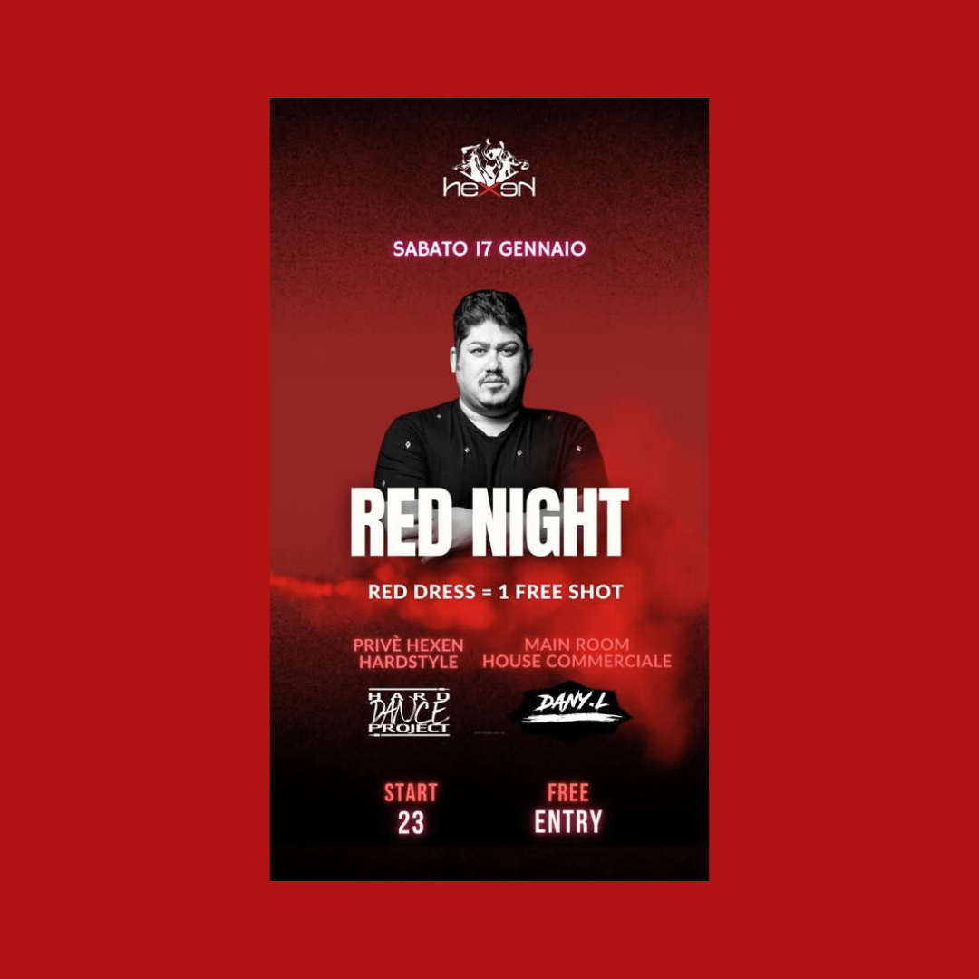 Dress code protagonista: rosso. Chi si presenta con un abito rosso riceve 1 free shot, per iniziare la serata nel modo giusto. Due ambienti, due stili musicali: nella main room spazio a house e commerciale con Dany.L, mentre nel privé Hexen arrivano le vibrazioni hardstyle con Base Project.